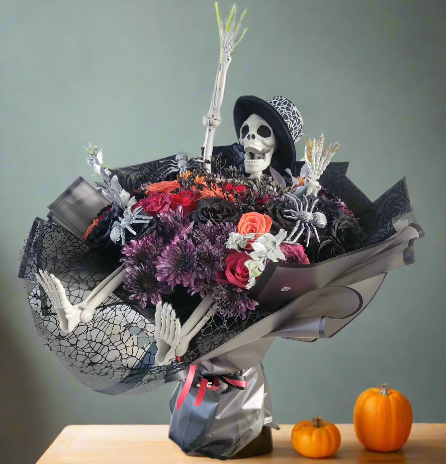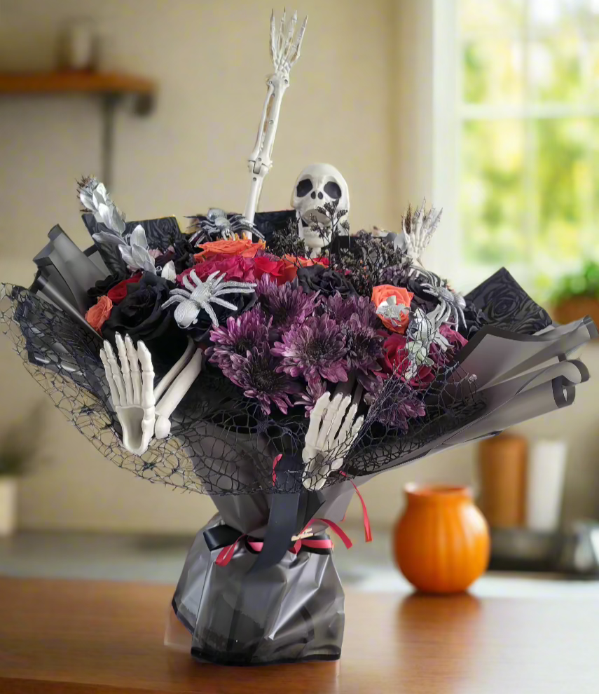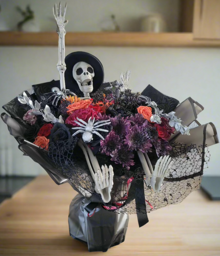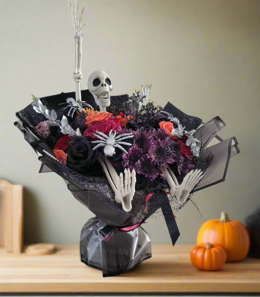 Introducing our Ghoulish Garden Halloween Bouquet! This hauntingly beautiful arrangement features a striking mix of orange, black, and crimson roses and poms, creating a dramatic and festive display. Nestled within the flowers, a large skeleton lounges playfully, adding a touch of eerie charm. Adorned with realistic spiders, this bouquet is wrapped in dark, luxurious paper combined with netted wrapping that mimics intricate spider webs. Perfect for adding a spooky yet elegant touch to your Halloween celebrations! 🎃🕷️💀