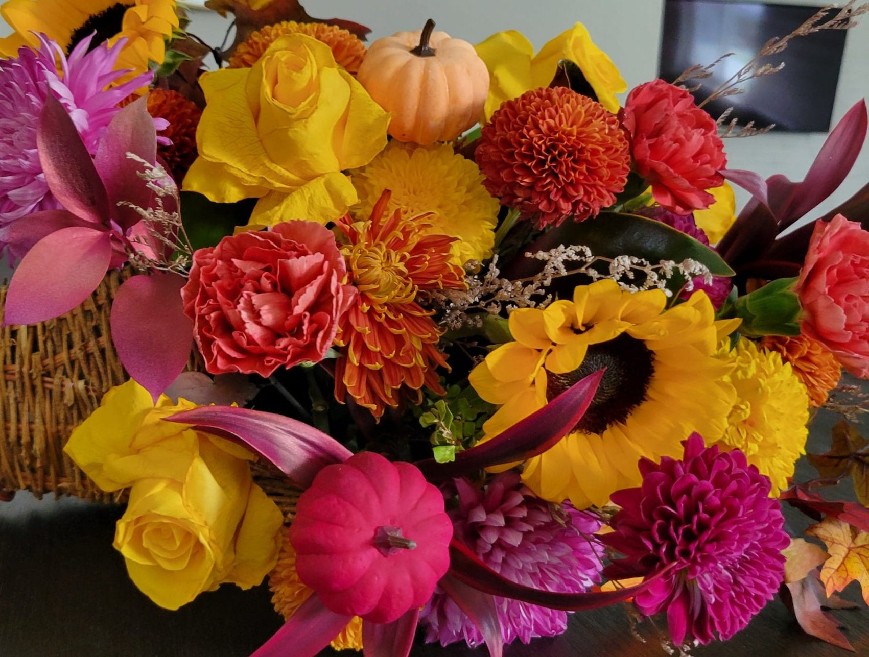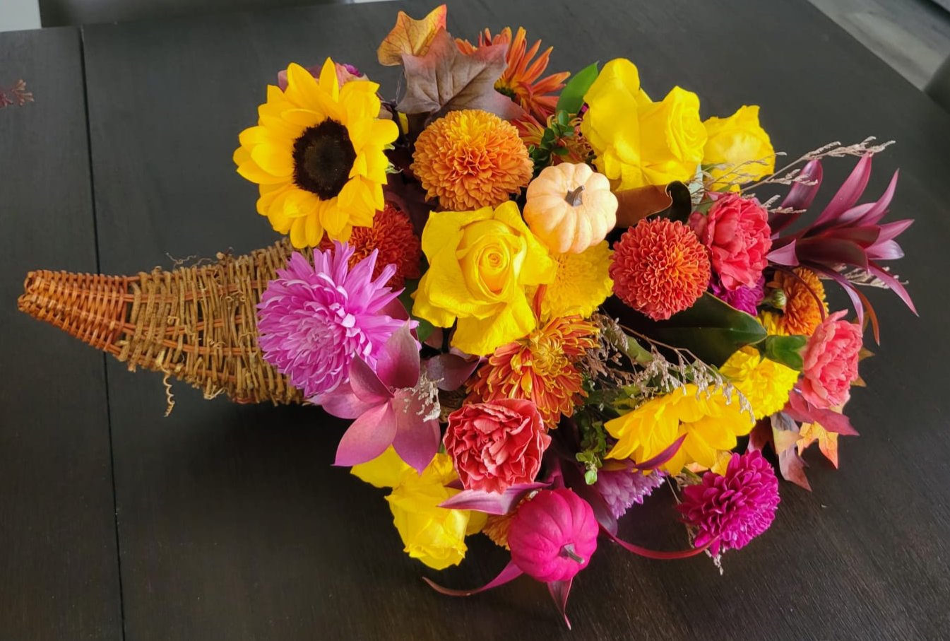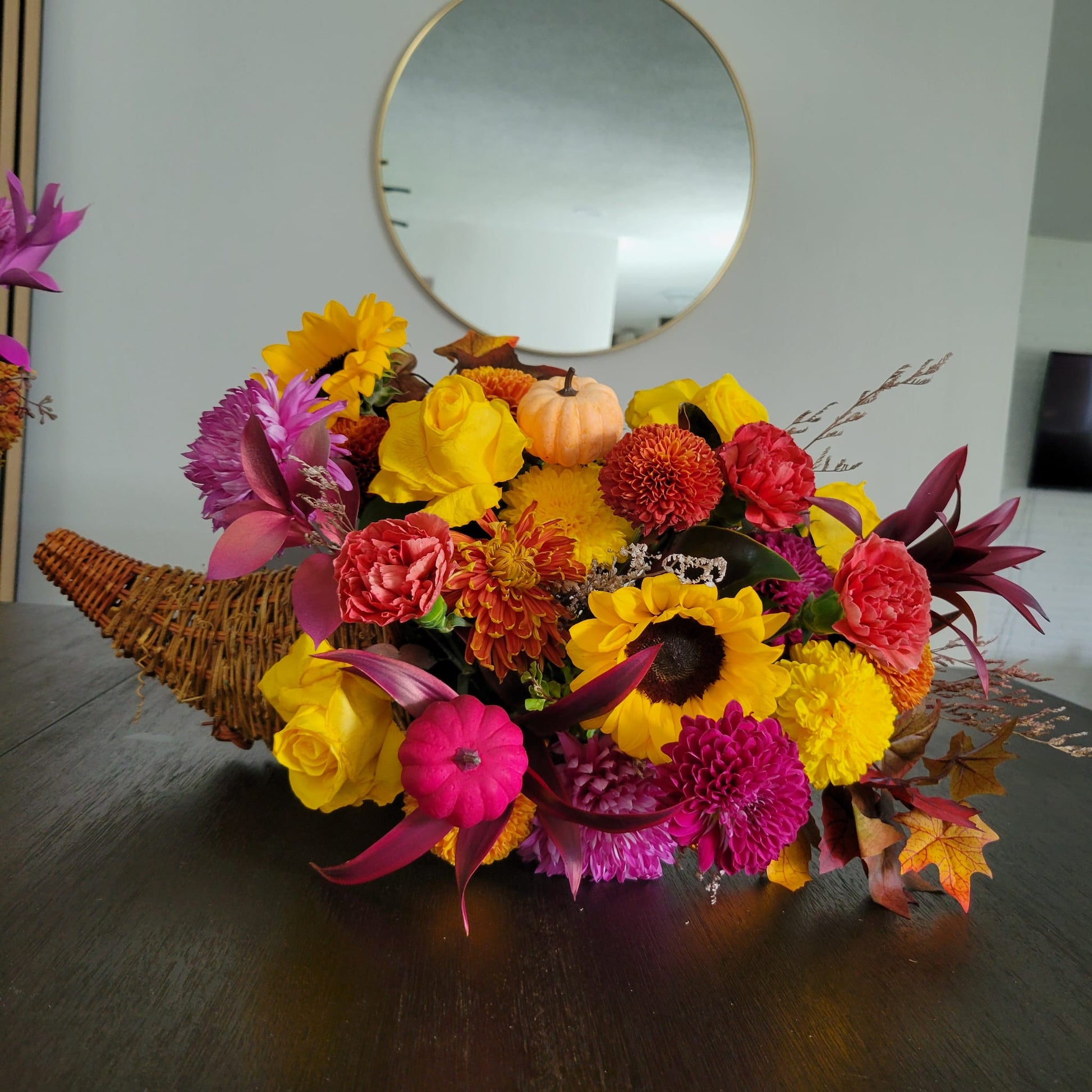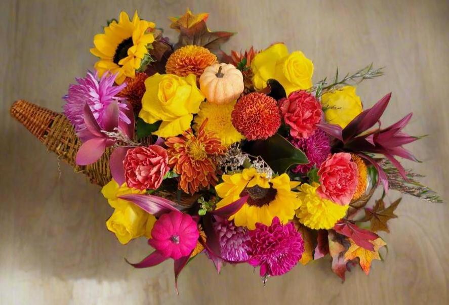 Time to ring in that most important meal of the year with the Cornucopia of Thanks! This eye-catching Thanksgiving arrangement is a true celebration of the season’s abundance. Nestled inside a classic cornucopia, you’ll find a vibrant mix of sunflowers, poms, and roses, all in rich, traditional fall colors. Accented with lush greens and the most adorable mini pumpkins, this arrangement captures the essence of Thanksgiving. Ideal for decorating your Thanksgiving table, gifting to loved ones, or simply bringing a touch of autumn into your home, “Cornucopia of Thanks” is a beautiful reminder of the abundance and gratitude that this holiday represents. Each bloom and pumpkin is thoughtfully arranged to create a harmonious blend of colors and textures, making it a centerpiece that will surely impress.