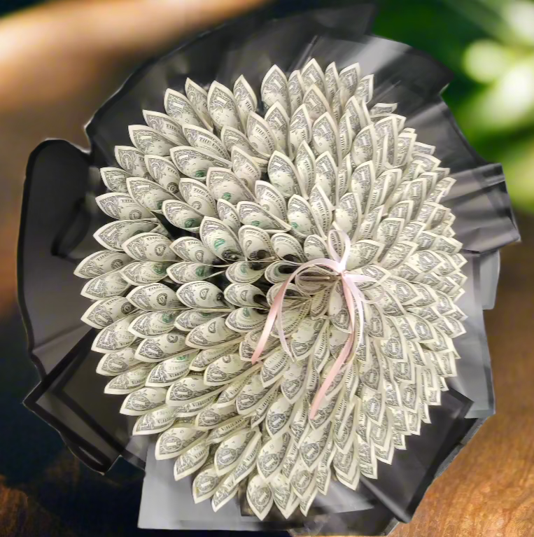 Surprise your loved ones with a unique and unforgettable gift – the “Prosperity Petals” Dollar Bill Bouquet! This exquisite arrangement features meticulously folded dollar bills, artfully crafted and arranged into a bouquet. Perfect for any occasion, this bouquet combines the elegance of floral design with the excitement of a cash gift. Whether it’s a birthday, anniversary, graduation, or just because, the “Prosperity Petals” bouquet is sure to impress and delight. Make your gift stand out with this one-of-a-kind creation that symbolizes both beauty and prosperity.