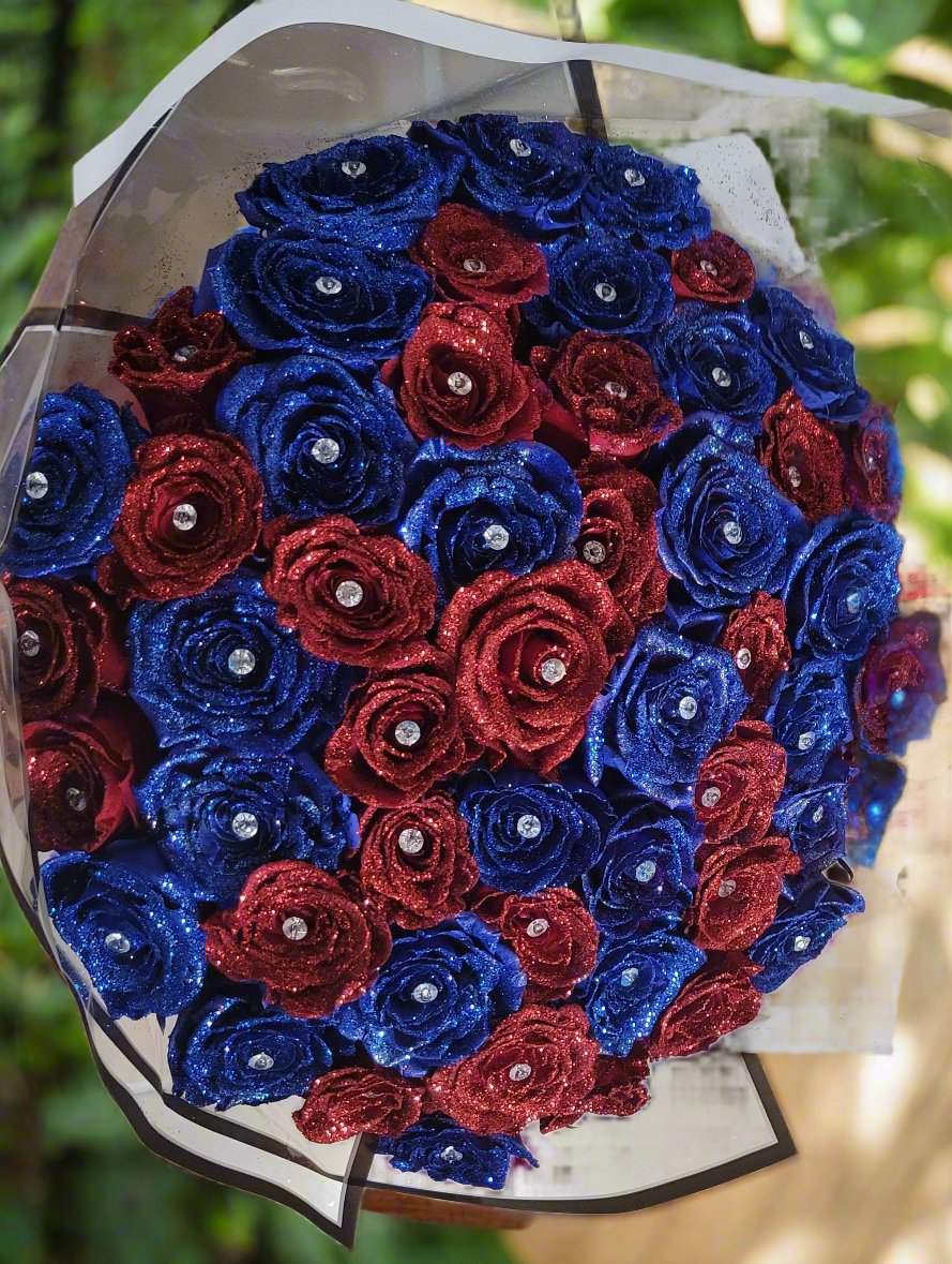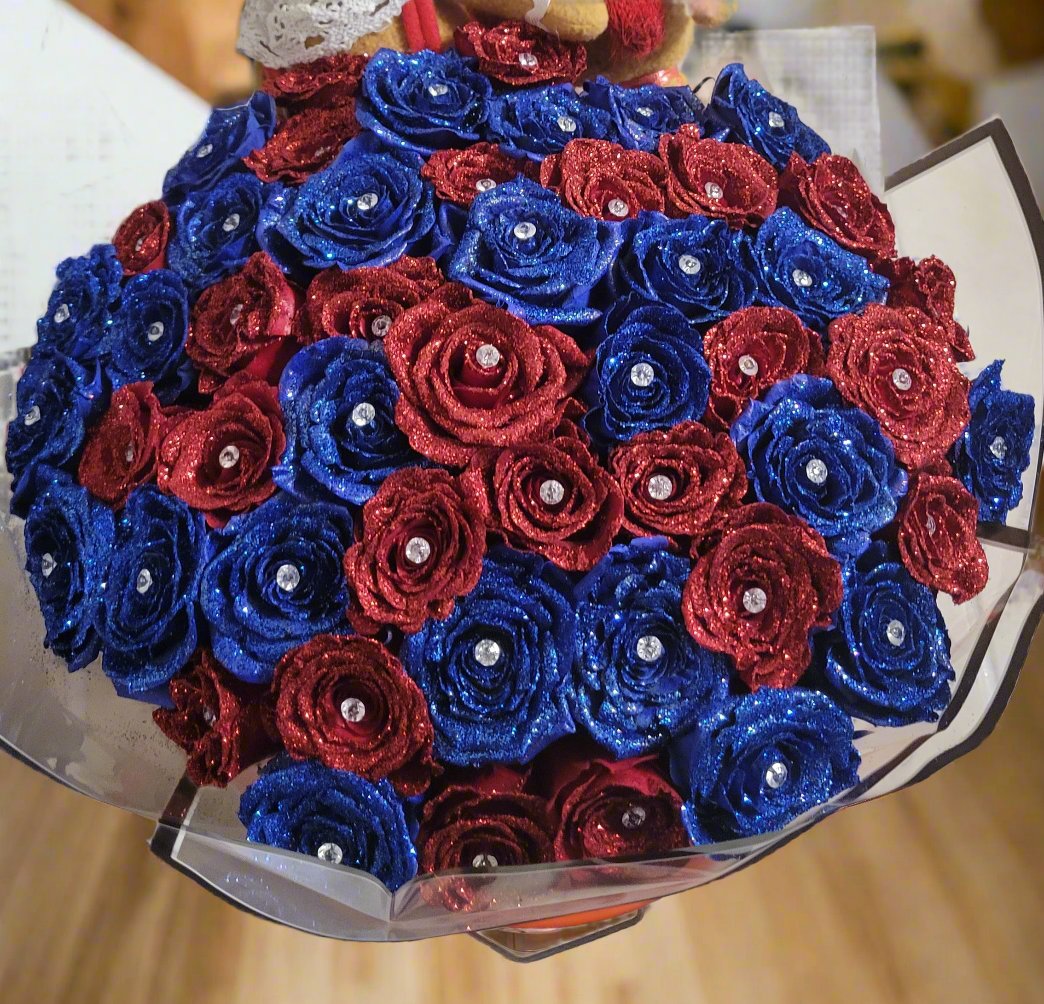 Experience the captivating blend of passion and mystery with our Scarlet & Azure Bouquet. Each bouquet features the classic elegance of red roses, symbolizing love and romance, paired with the enchanting allure of blue roses, representing mystery and unattainable desires. This unique combination creates a stunning visual contrast that is perfect for expressing deep emotions and hidden feelings. 🌹💙