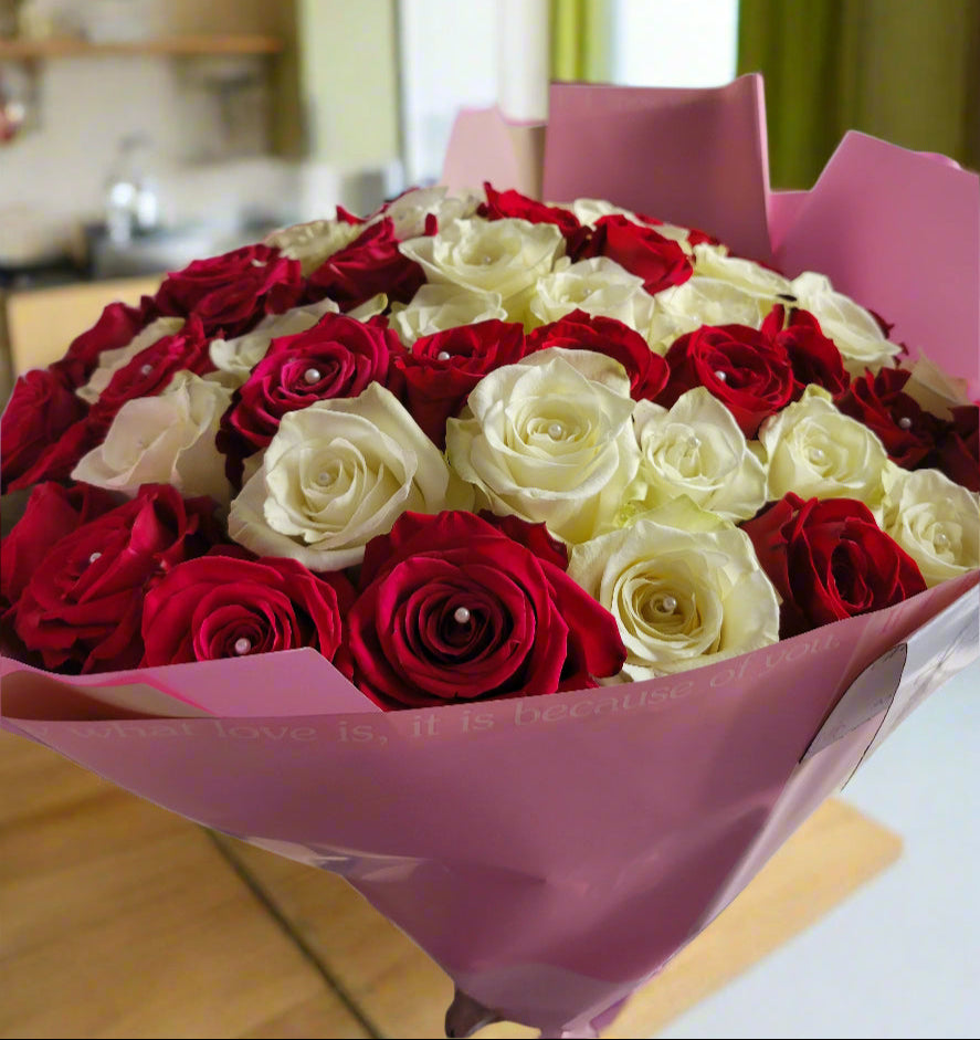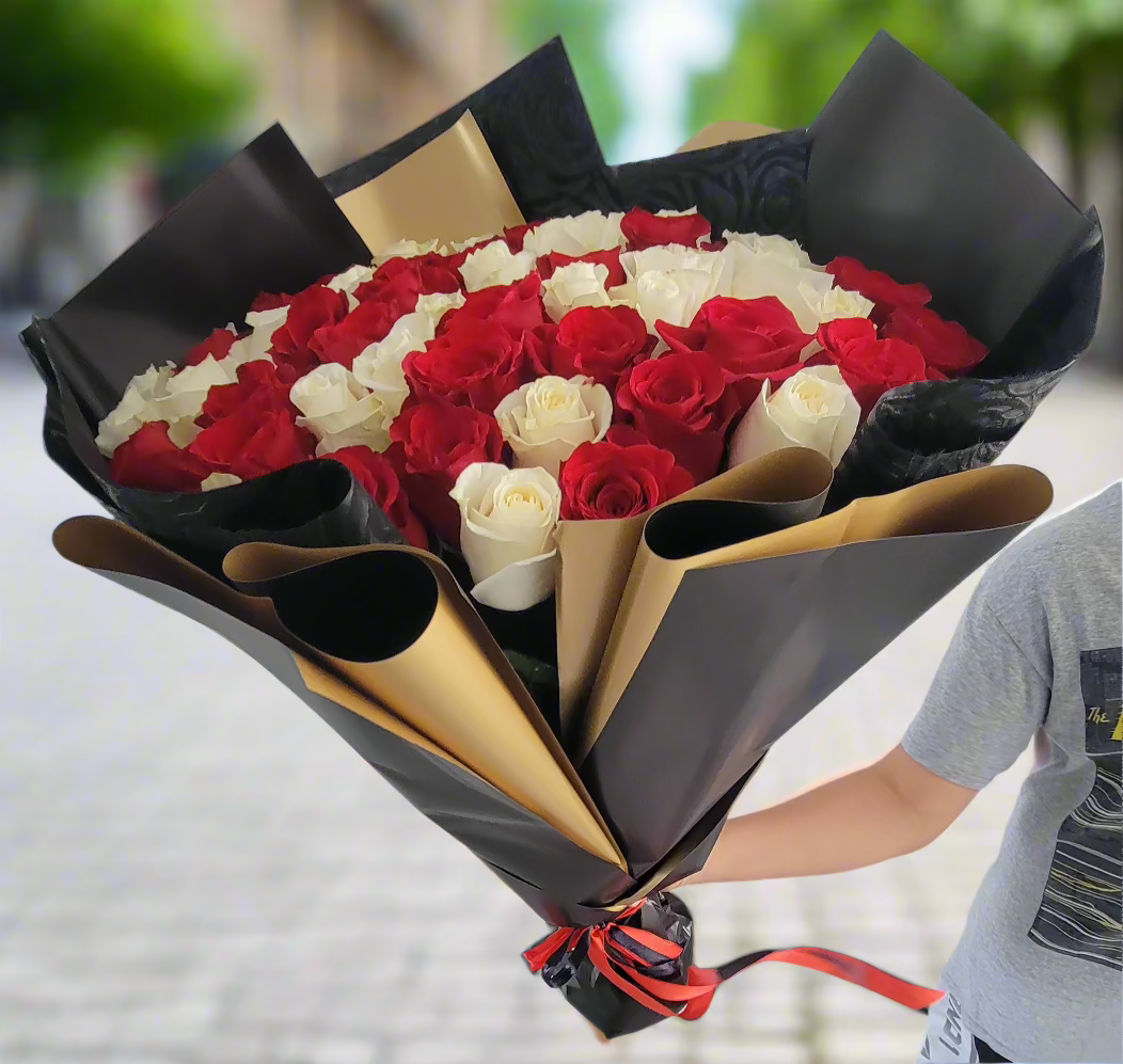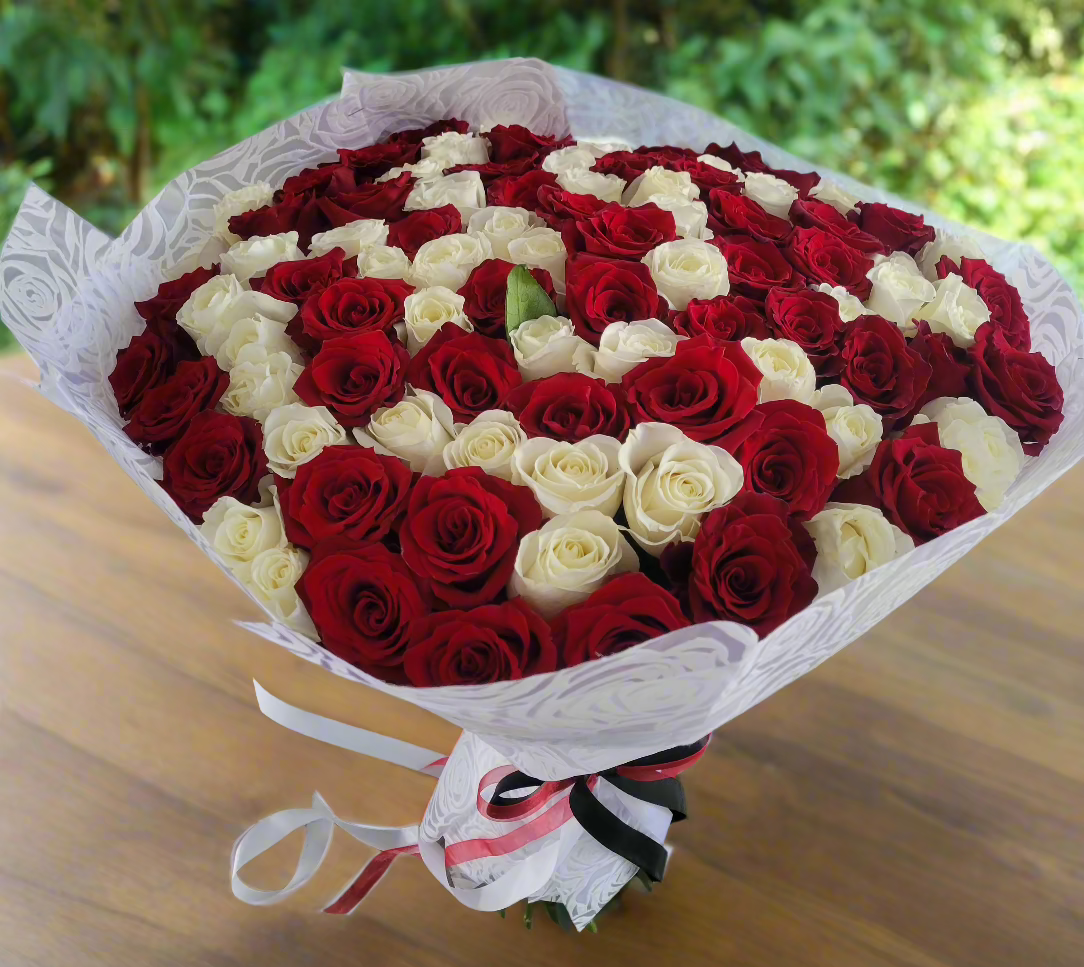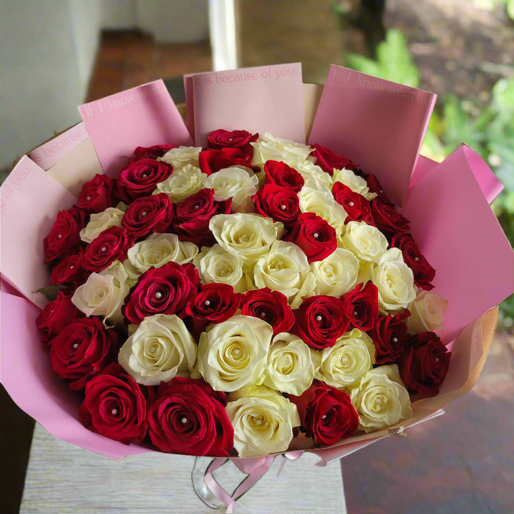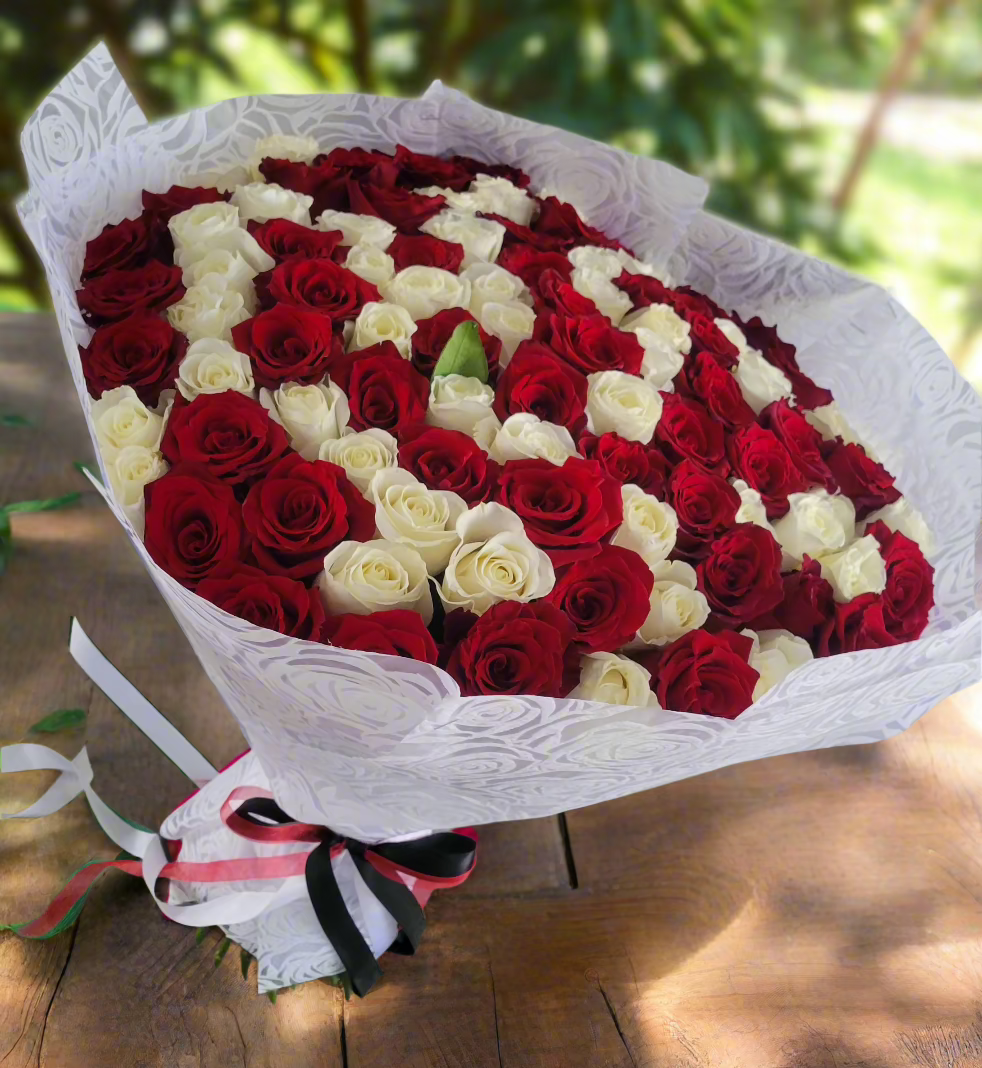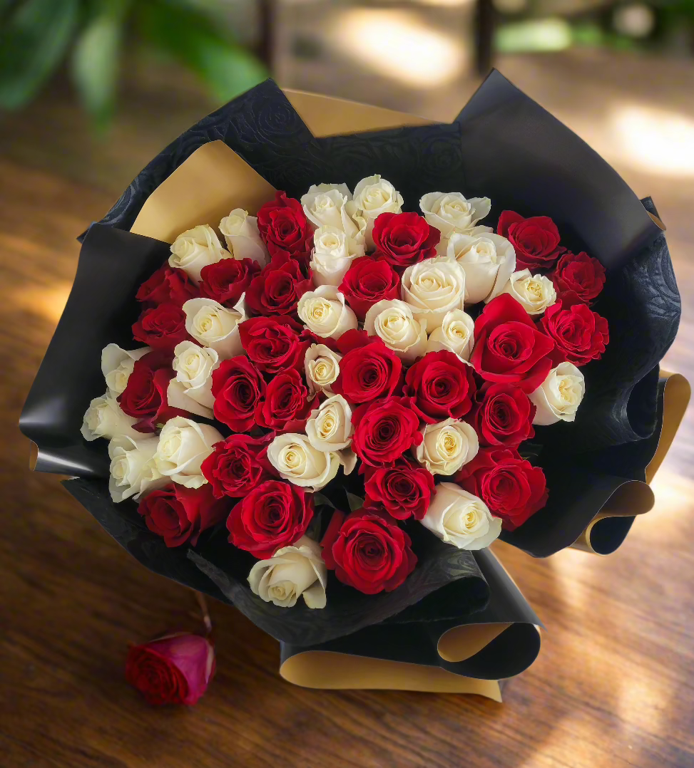 Love's Symphony is an amazing arrangement of red and white roses that speaks volumes of love and unity. This exquisite bouquet features the passionate allure of red roses intertwined with the pure grace of white roses, creating a harmonious blend that is both visually captivating and deeply meaningful.