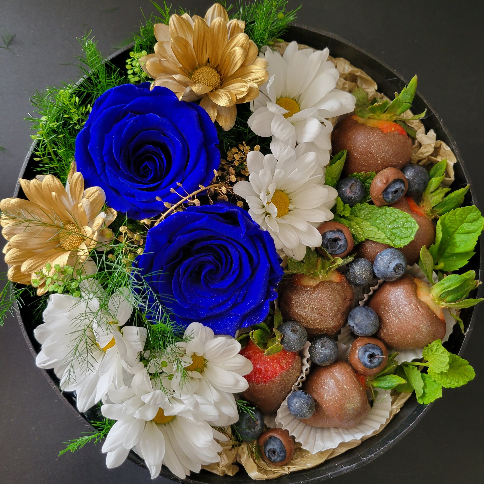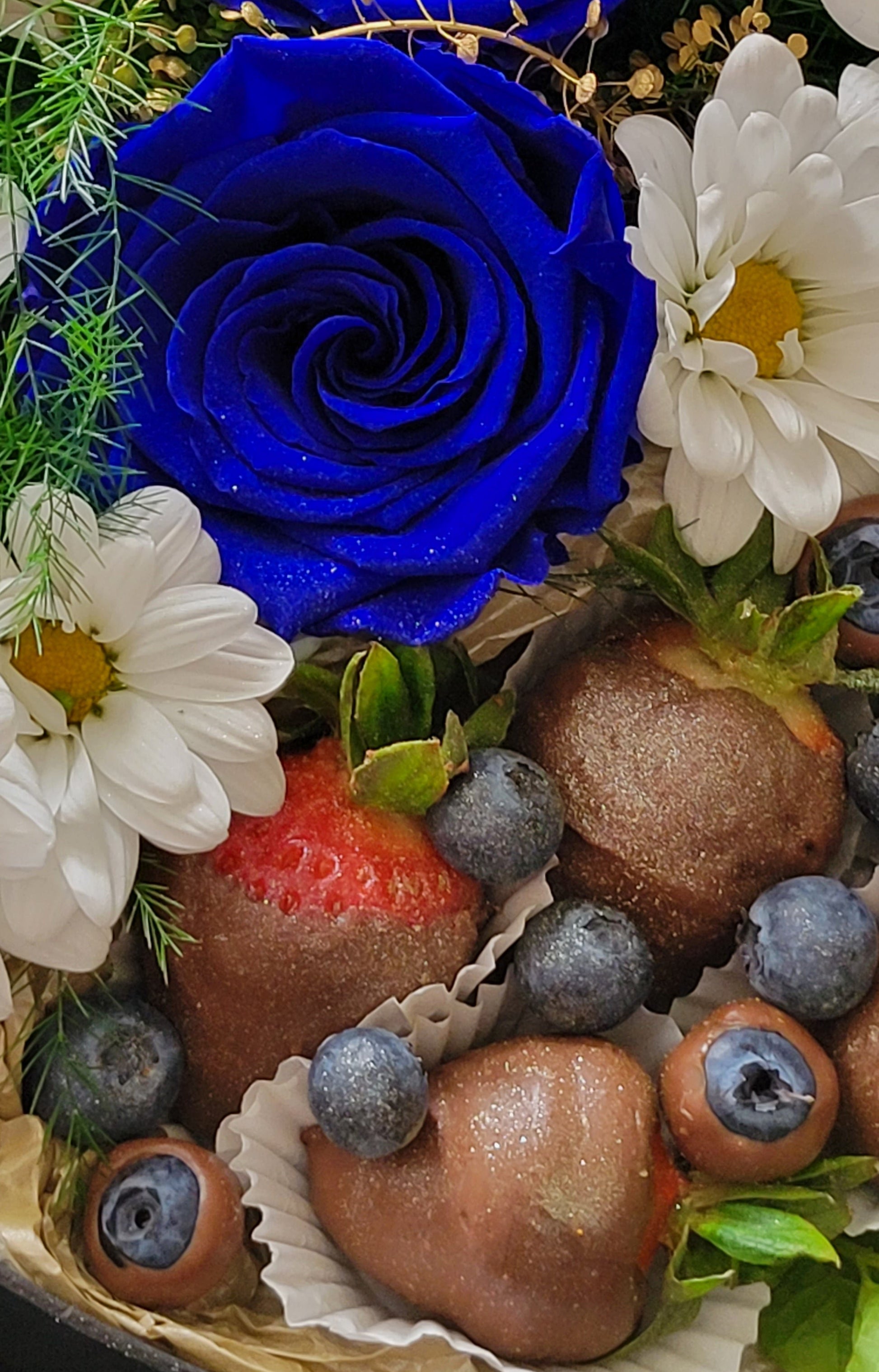 This exquisite arrangement features luscious chocolate-covered strawberries and blueberries, nestled amidst a stunning array of blue, white, and gold flowers. The unique combination of gourmet delights and floral elegance makes the Bloom & Berry Box a standout gift. It’s not just a treat for the taste buds but also a feast for the eyes, making it the perfect way to show your love and appreciation.