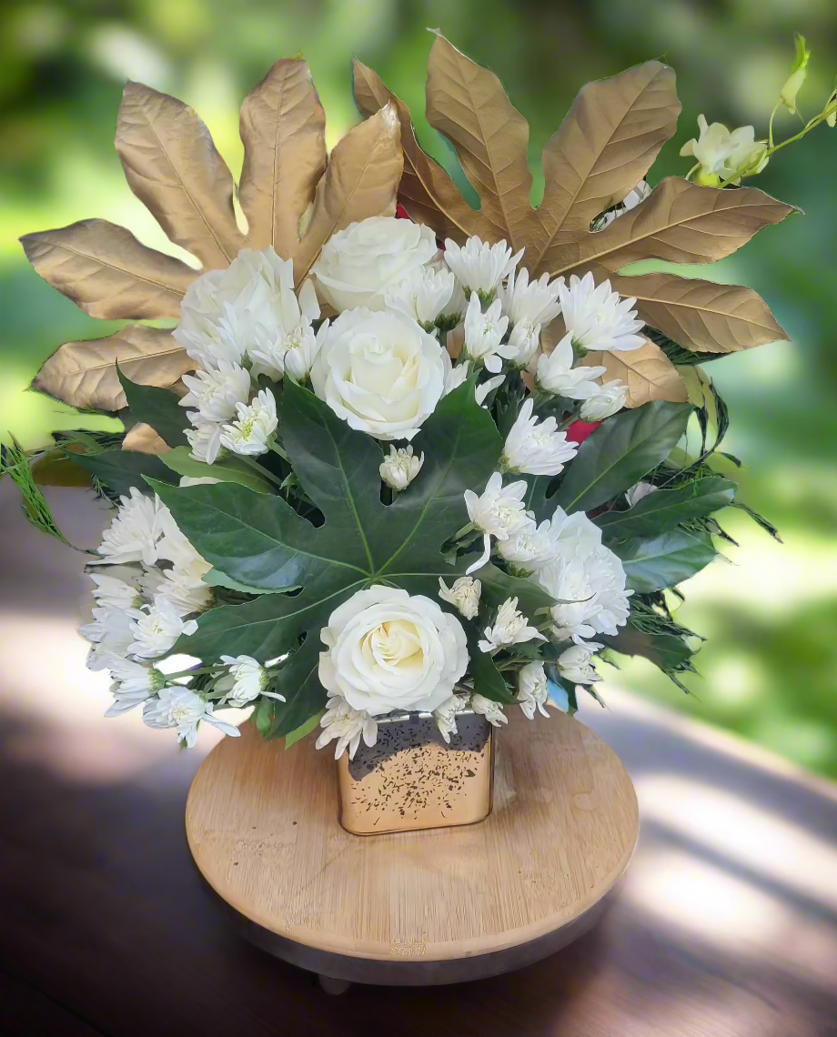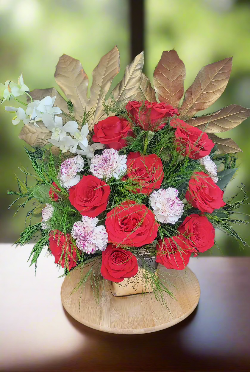 Discover the captivating beauty of the Golden Vase Arrangement, an interesting two-sided floral masterpiece. One side features passionate red roses, while the other showcases pristine white roses, symbolizing love and purity. Adorned with delicate carnations and lush greens, this arrangement is a perfect blend of contrast and harmony.