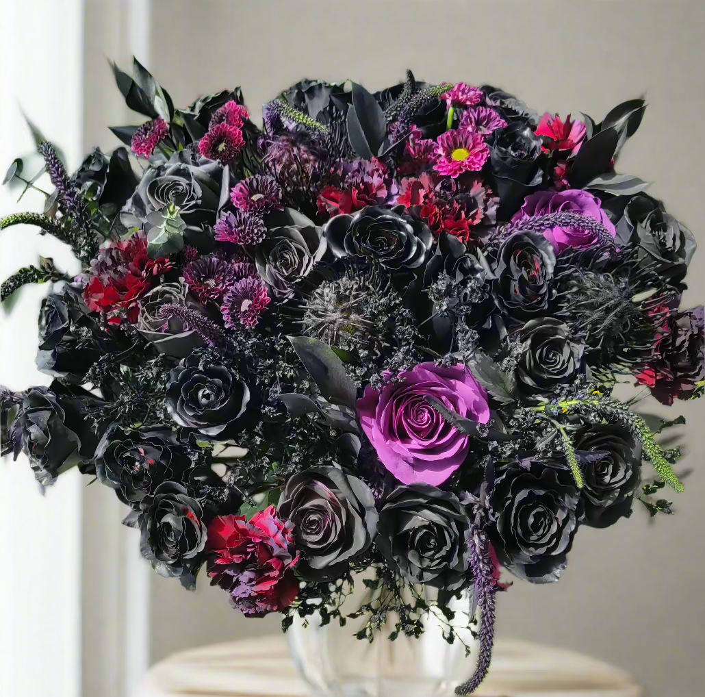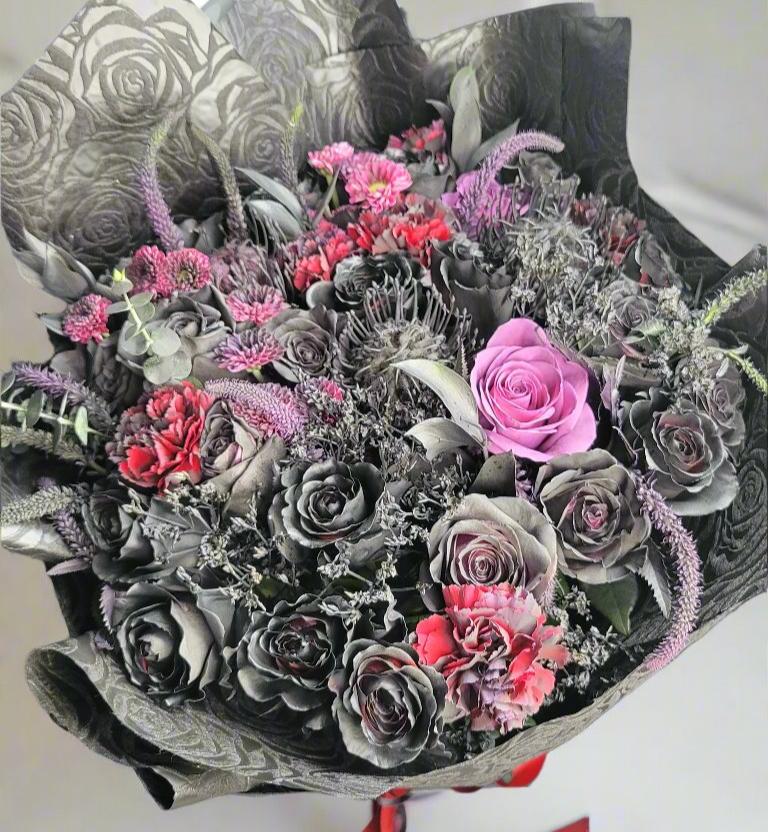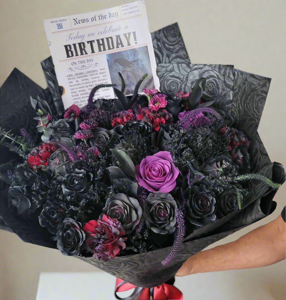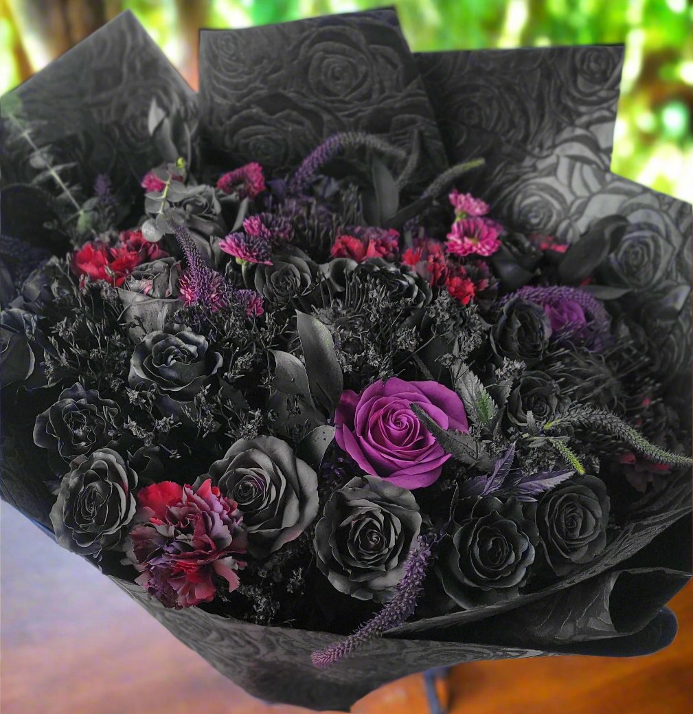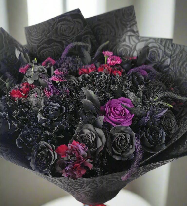 Step into the realm of the extraordinary with our Gothic Noir Rose Bouquet. Each rose, cloaked in deep, velvety black, with a mix of sinister purples, embodies the essence of gothic elegance. This bouquet is a celebration of the unconventional, where the dark hues symbolize mystery, strength, and a beauty that defies the ordinary.