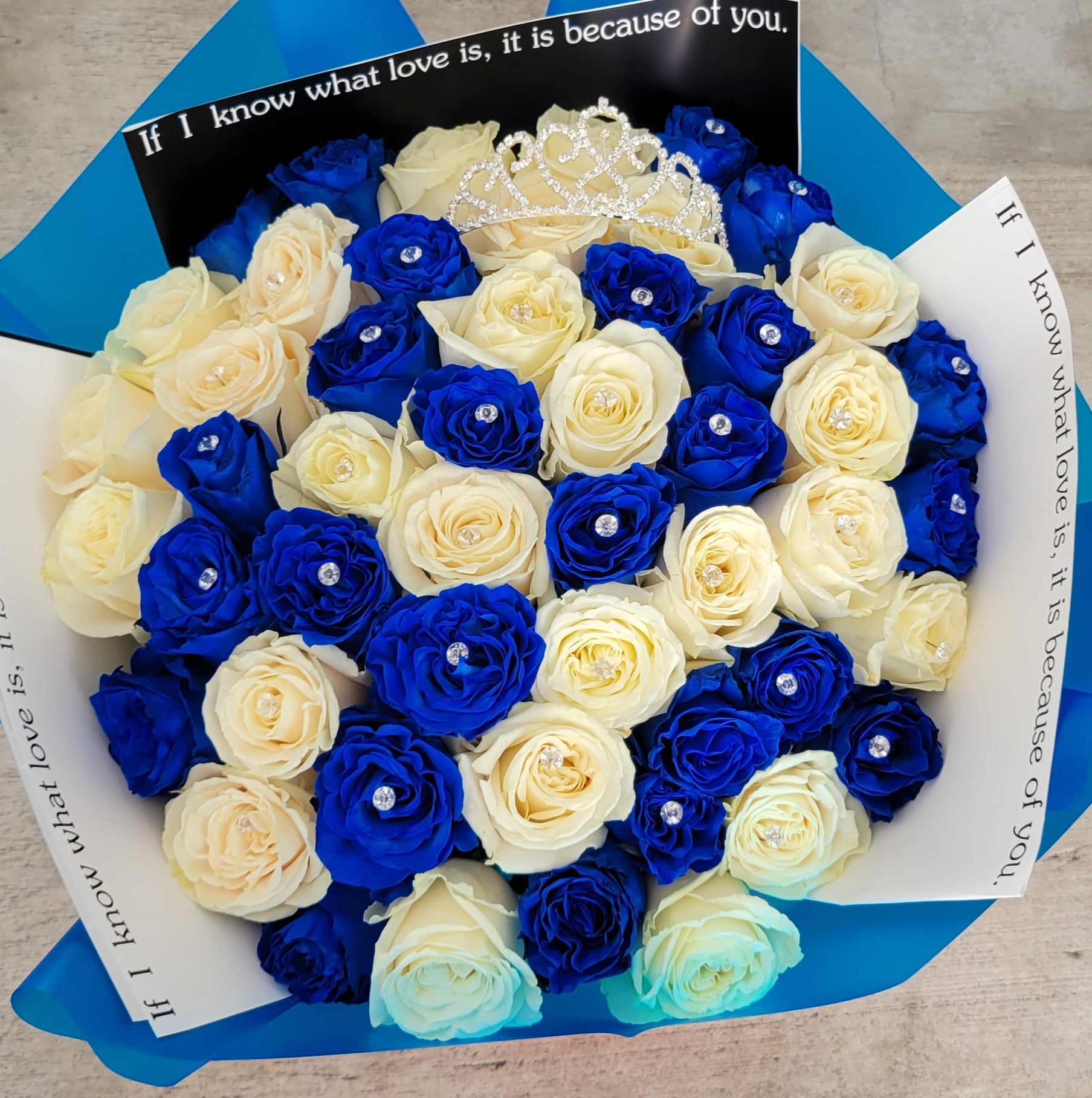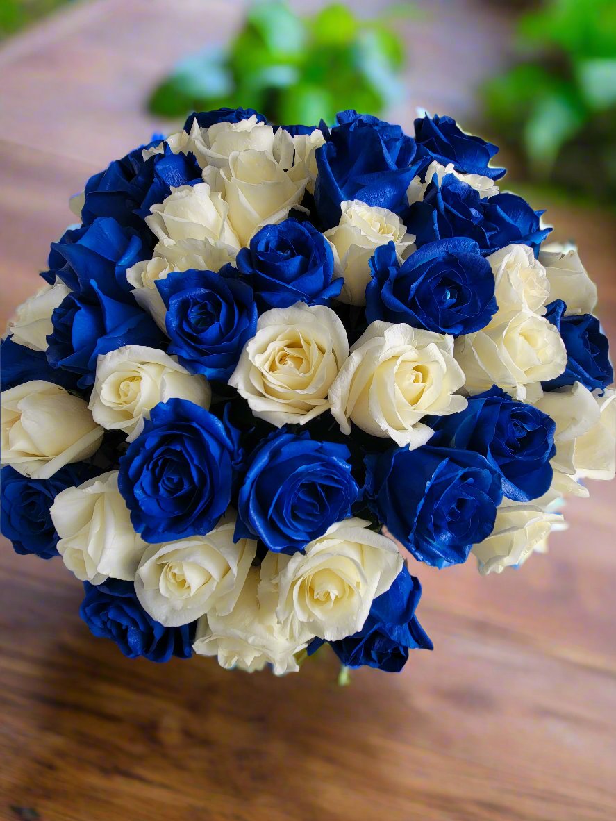 Discover the tranquil beauty of our Serenity’s Blues bouquet, a mesmerizing arrangement of blue and white roses that embodies peace and rarity.