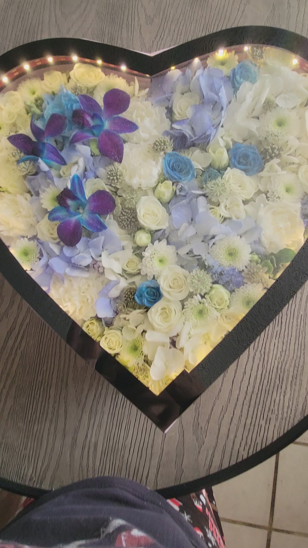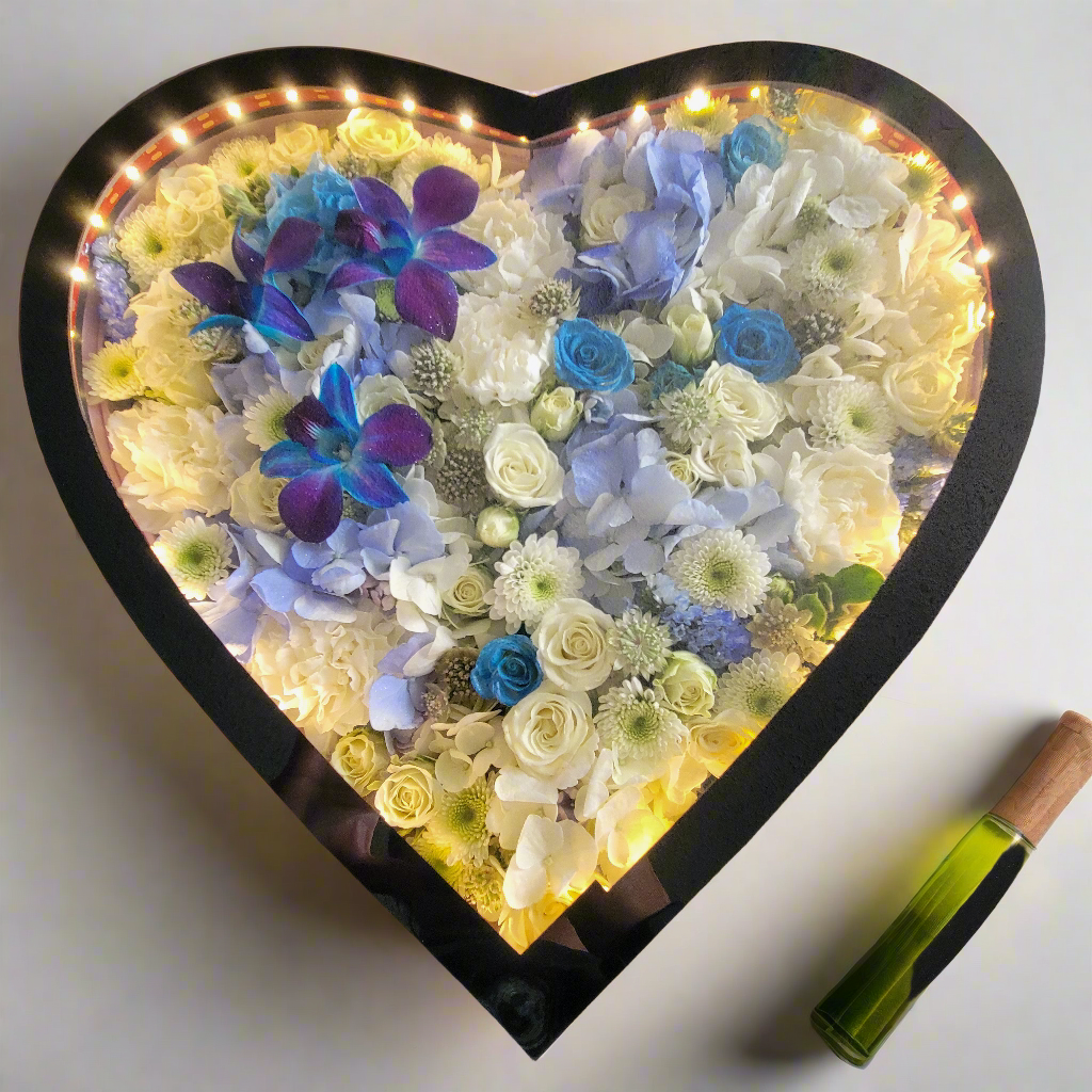 Unveil the magic of romance with our Enchanted Heart Floral Symphony. Nestled within a heart-shaped box, this exquisite arrangement features a harmonious blend of poms, orchids, spray roses, and hydrangeas. The flowers are meticulously selected in a palette of pristine white, serene shades of blue, and enchanting violet, creating a visual symphony that captivates the senses.