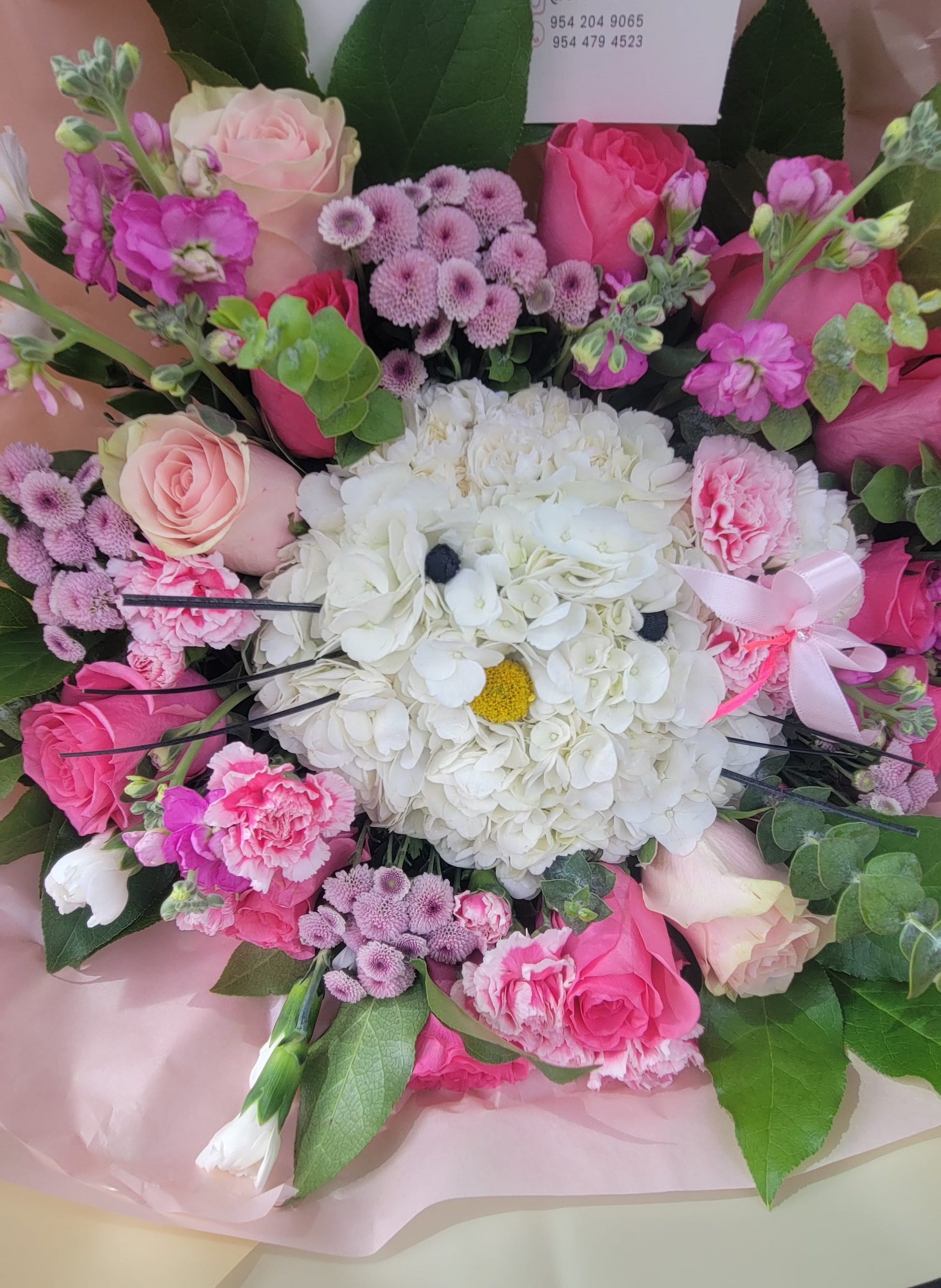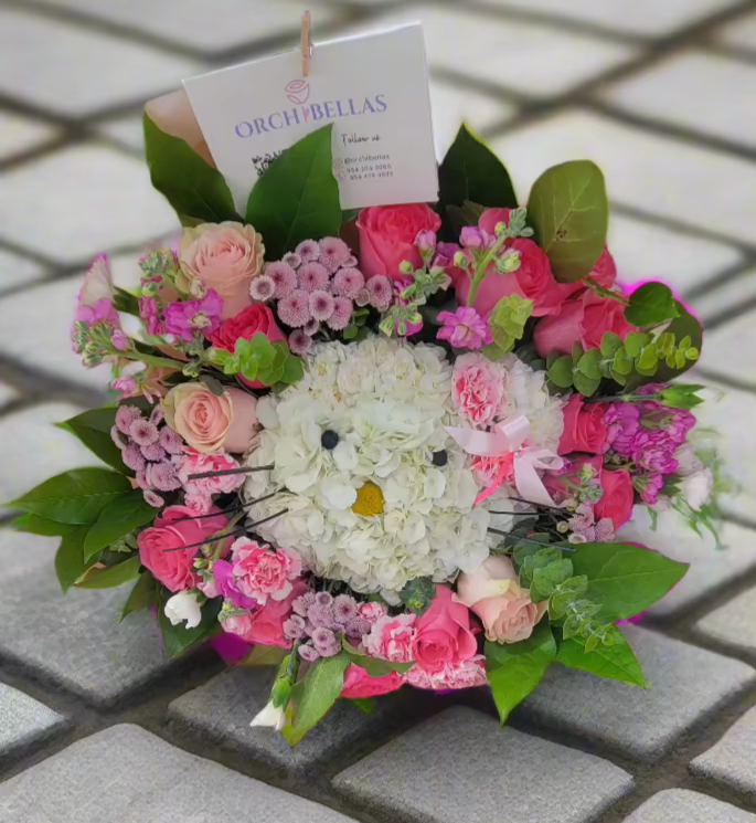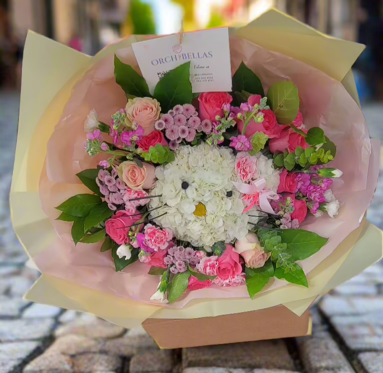 This Kathy's Hands creation was inspired by the customer informing us that his wife loves Hello Kitty. He left it all up to Kathy on how to incorporate Hello Kitty into the arrangement. Katherine and her imagination began to work and concluded with an almost identical replica. It's the first of its kind, but hopefully, not the last. Order yours today!